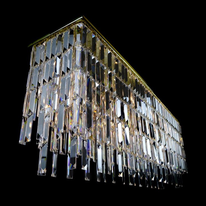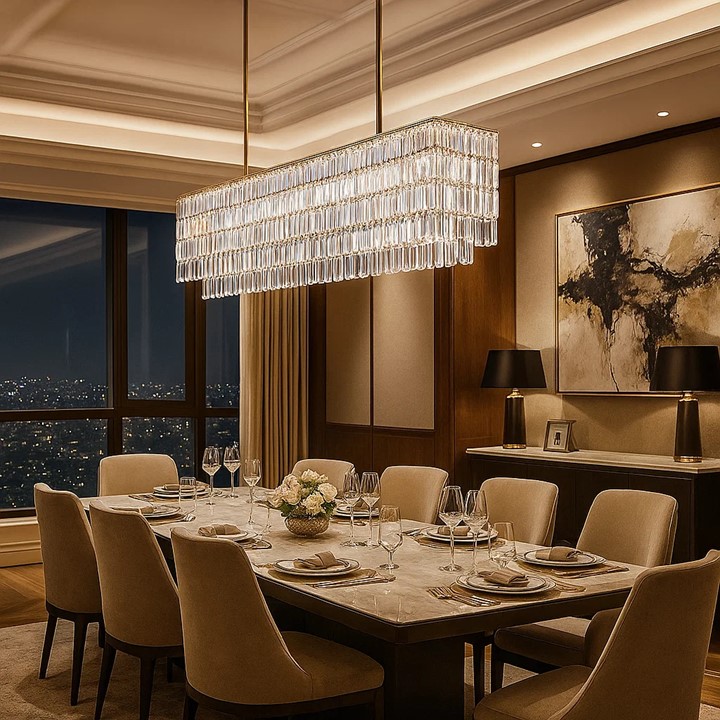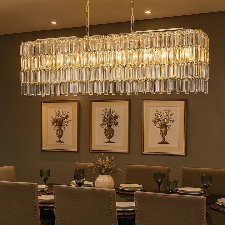 Với chiều dài lên tới 140cm, đèn được thiết kế để treo ngang, tạo sự cân đối hoàn hảo với các kiểu bàn ăn chữ nhật phổ biến. Cấu trúc khung kim loại thanh mảnh kết hợp cùng các dải pha lê cao cấp được cắt mài chính xác, tạo nên hiệu ứng ánh sáng lung linh, tinh tế nhưng không kém phần sang trọng.