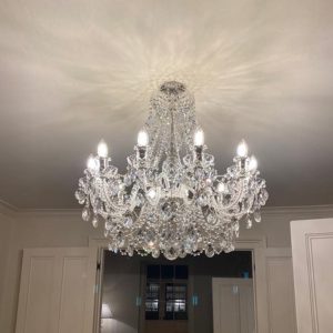 Phần thân đèn được bao phủ bởi các ống pha lê sáng trong, kết hợp cùng tay đèn xoắn và những viên pha lê mài thủ công sắc sảo. Tất cả tạo nên một tổng thể hài hòa, sang trọng và giàu tính nghệ thuật – đúng chất đèn chùm pha lê cao cấp từ châu Âu.
