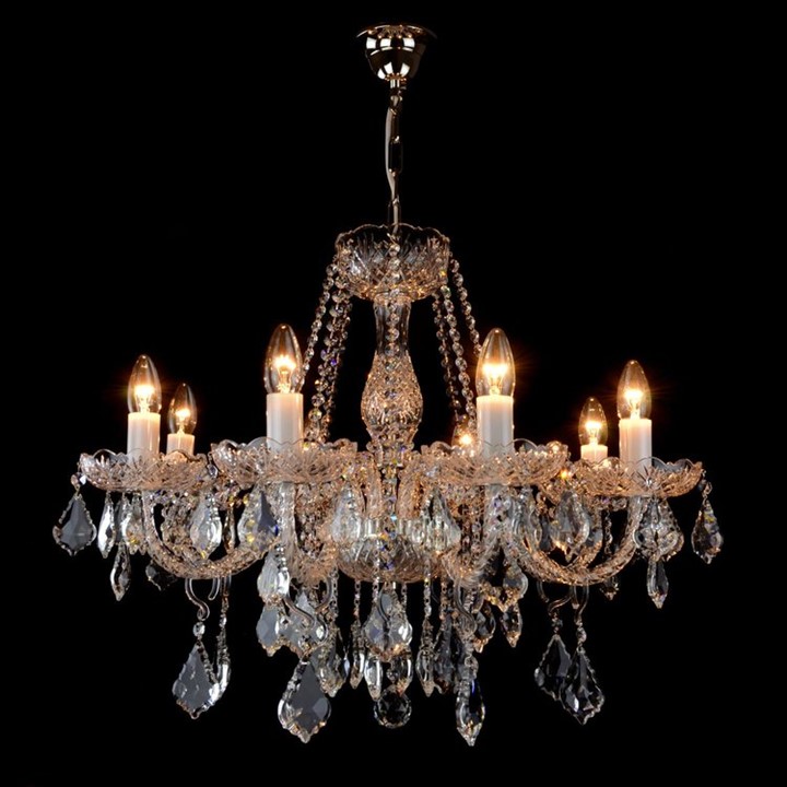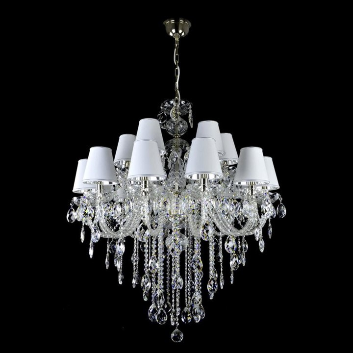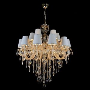 Tay đèn được tạo hình từ pha lê xoắn thủ công, mang vẻ đẹp mềm mại và thanh thoát. Phía trên mỗi tay đèn là chụp đèn vải cao cấp, không chỉ tạo nên diện mạo hoài cổ đặc trưng của phong cách Tân Cổ Điển, mà còn giúp điều hướng ánh sáng, tập trung chiếu xuống các chuỗi hạt pha lê bên dưới – tạo nên hiệu ứng ánh sáng đầy chiều sâu và chuyển động.